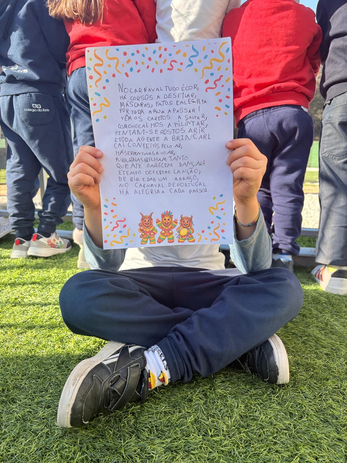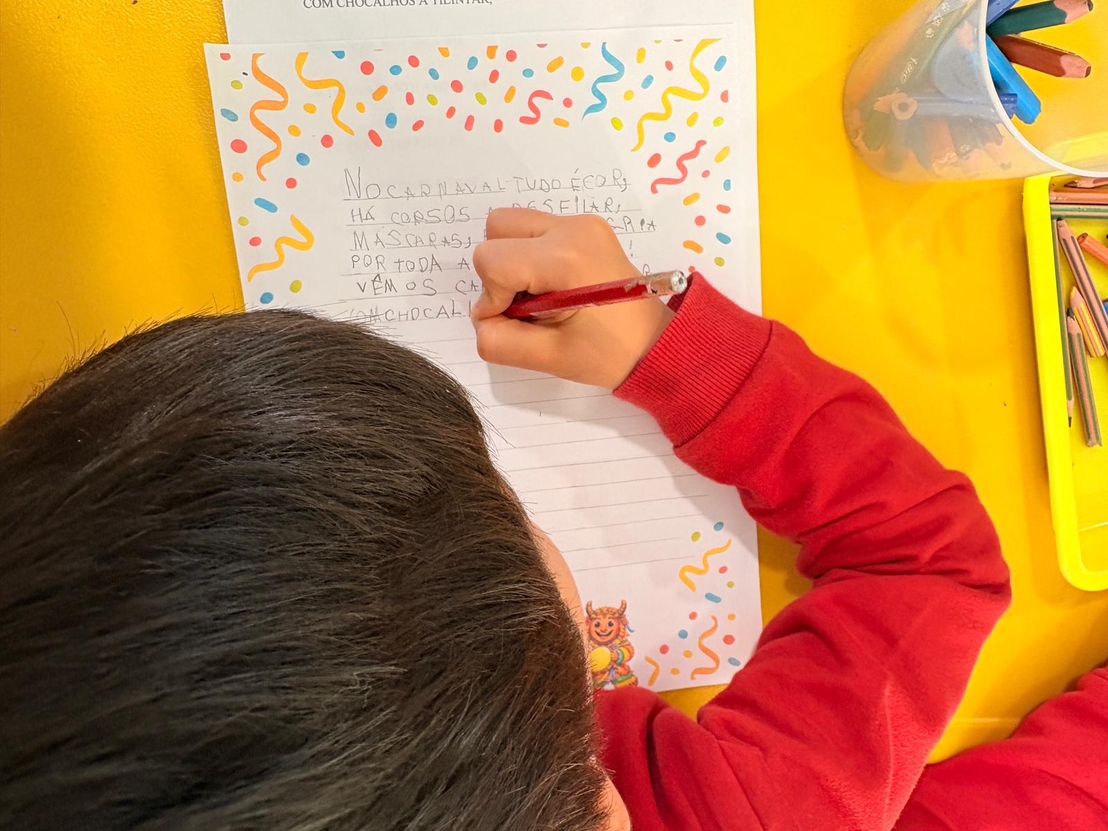 Na área do Português, entre risadas, lápis e muita imaginação as crianças foram incentivadas a criar um poema sobre o Carnaval, onde as suas ideias, emoções e criatividade tiveram voz ativa. Assim foi promovido o desenvolvimento da linguagem oral e escrita, onde enriqueceram o seu vocabulário e o gosto pela poesia, valorizando o respeito pelo outro, a expressão pessoal e do grupo, pois a poesia lúdica é um “(…) campo particularmente fértil na escrita para os mais novos, caracteriza-se por um esforço do poder da comunicação sonora, o que resulta numa menor atenção ao significado das palavras e uma maior incidência no efeito de jogo das sonoridades construídas pelo poema” ( Cevera citado por Bastos, 1999, p. 164).