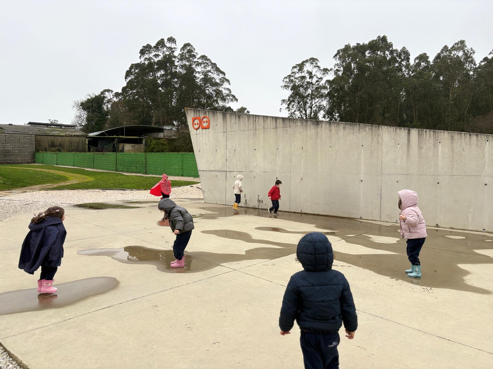 Aproveitamos os dias chuvosos, para participar num momento de brincadeira ao ar livre, onde exploramos as poças de água equipados com as nossas galochas e casacos impermeáveis. As crianças contactaram com a natureza, exploraram sensorialmente e brincaram livremente, promovendo a motricidade global e autonomia, pois ao brincarem no exterior “podem observar e experimentar no seu próprio corpo as mudanças de temperatura, os fenómenos atmosféricos, as mudanças da natureza.” (Borràs,2002, p.177).